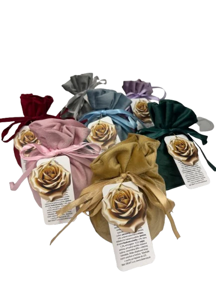 Čokoládové pralinky v saténovom mešci od Talianskeho výrobcu MAITRE TRUFFOUT, samostatne balené vo farebnej fólii, mix príchutí lieskový oriešok, káva a mlieko. Balenie obsahuje 200g praliniek. Rozmery balenia V/Š/H 14cm / 10cm / 10cm.
