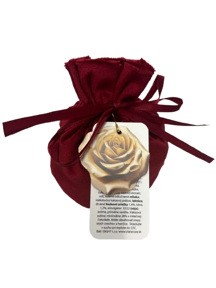 Čokoládové pralinky v saténovom mešci od Talianskeho výrobcu MAITRE TRUFFOUT, samostatne balené vo farebnej fólii, mix príchutí lieskový oriešok, káva a mlieko. Balenie obsahuje 200g praliniek. Rozmery balenia V/Š/H 14cm / 10cm / 10cm.