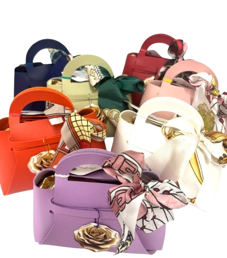 Kabelka z umelej kože obsahuje zlaté vrecko plné čokoládových praliniek od Talianskeho výrobcu MAITRE TRUFFOUT, pralinky sú samostatne balené v lesklej fólii, mix príchutí lieskovo-orieškové, kávové a mliečne. Balenie obsahuje 100g praliniek. Rozmery balenia V/Š/H 12cm / 11cm / 6cm.