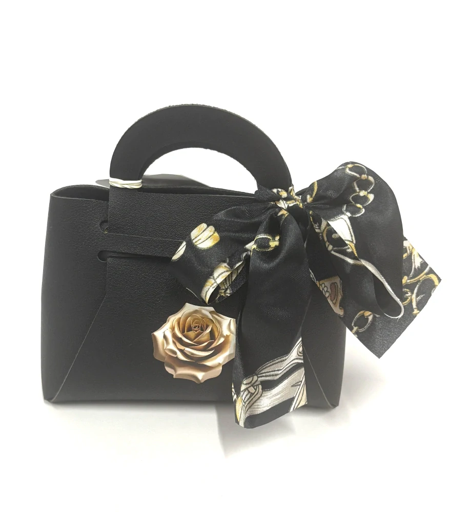 Kabelka z umelej kože obsahuje zlaté vrecko plné čokoládových praliniek od Talianskeho výrobcu MAITRE TRUFFOUT, pralinky sú samostatne balené v lesklej fólii, mix príchutí lieskovo-orieškové, kávové a mliečne. Balenie obsahuje 100g praliniek. Rozmery balenia V/Š/H 12cm / 11cm / 6cm.