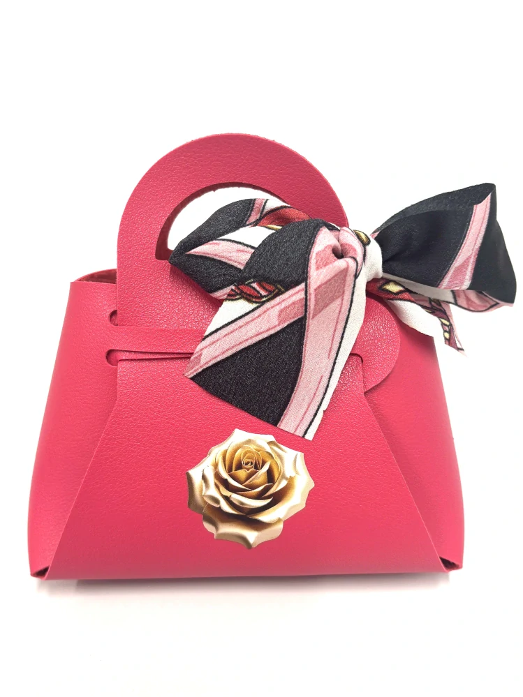 Kabelka z umelej kože obsahuje zlaté vrecko plné čokoládových praliniek od Talianskeho výrobcu MAITRE TRUFFOUT, pralinky sú samostatne balené v lesklej fólii, mix príchutí lieskovo-orieškové, kávové a mliečne. Balenie obsahuje 100g praliniek. Rozmery balenia V/Š/H 12cm / 11cm / 6cm.