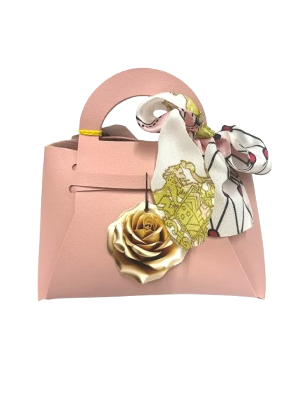 Kabelka z umelej kože obsahuje zlaté vrecko plné čokoládových praliniek od Talianskeho výrobcu MAITRE TRUFFOUT, pralinky sú samostatne balené v lesklej fólii, mix príchutí lieskovo-orieškové, kávové a mliečne. Balenie obsahuje 100g praliniek. Rozmery balenia V/Š/H 12cm / 11cm / 6cm.
