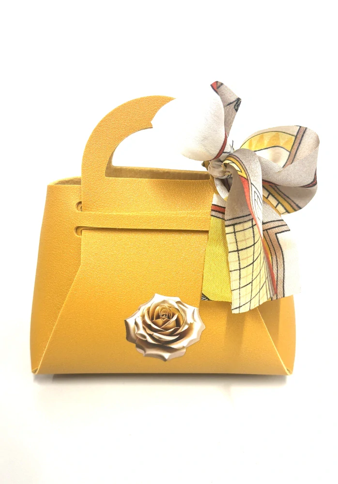 Kabelka z umelej kože obsahuje zlaté vrecko plné čokoládových praliniek od Talianskeho výrobcu MAITRE TRUFFOUT, pralinky sú samostatne balené v lesklej fólii, mix príchutí lieskovo-orieškové, kávové a mliečne. Balenie obsahuje 100g praliniek. Rozmery balenia V/Š/H 12cm / 11cm / 6cm.